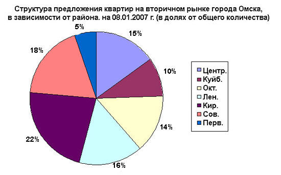 Рассматривая структуру предложения квартир на вторичном рынке города, в зависимости от района, видно, что максимальная доля 22% принадлежит Кировскому району, что объясняется максимальной площадью, которую он занимает. При этом, в других районах велика доля частного сектора, который сужает ареал предложений в благоустроенных домах. Размером площади района объясняется минимальная доля 5% – Первомайского и 10% – Куйбышевского районах.