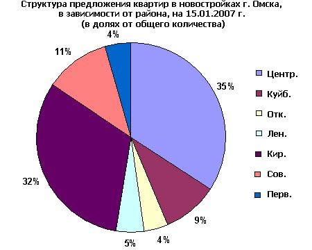 Из структуры предложения квартир на новостройки города, в зависимости от района, видно, что наибольшие доли: 35% и 32% принадлежат Центральному и Кировскому районам. Данная раскладка объясняется количеством строительных площадок, сконцентрированных в центральной части города и на Левобережье. Такая ситуация продиктована как стратегией развития города, так и в большей мере интересами инвесторов.