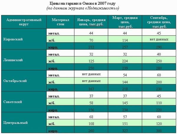 Данные по ценам в январе, марте и сентябре 2007 года в зависимости от местоположения и материала стен представлены в таблице. Кирпичные гаражи, как капитальные строения, являются одним из видов недвижимого имущества, поэтому и стоят почти в пять раз дороже металлических, и в полтора раза – железобетонных. Любопытно, что стоимость гаражей по некоторым позициям нашей таблицы в начале года претерпела бОльшие изменения, чем в весенне-летние месяцы.
