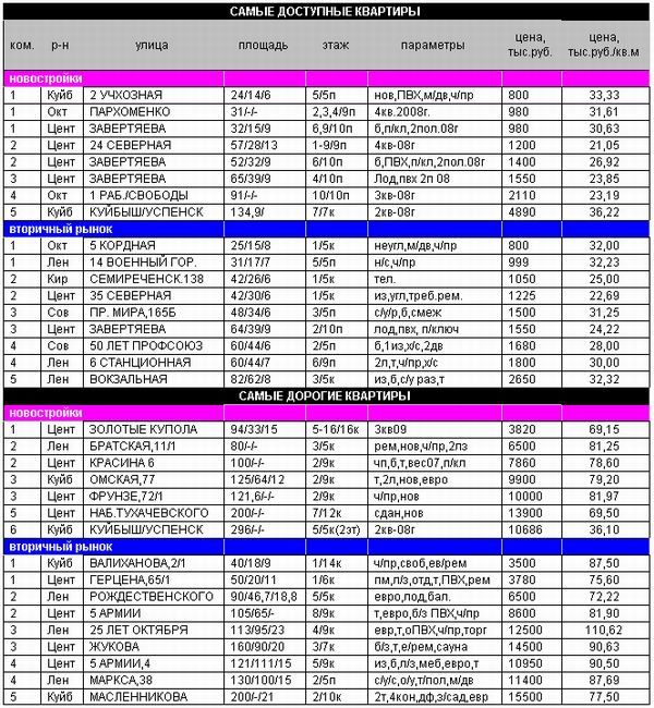 Каждый месяц аналитик ИД «Премьер» Наталия Копылова обобщает информацию о ценах на самые доступные и самые дорогие квартиры на омском рынке жилой недвижимости. Ниже в таблице представлены цены самых доступных и самых дорогих квартир, которые предлагали на омском рынке новостроек и вторичного жилья по состоянию на 10 октября 2007 г. Выбор предложений сделан из базы данных журнала «Недвижимость», которая включает около 25 тысяч объявлений.