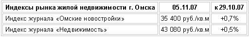 По данным журнала «Омские новостройки» (ИД «Премьер») на 5 ноября 2007 года, стоимость одного квадратного метра жилья на "первичном" рынке составила 35 400 рублей, что на 240 рублей или 0,7% больше, чем неделю назад. В целом с начала года цены в новостройках выросли на 38,7%.