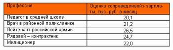 По мнению жителей Омска, "справедливая" ежемесячная зарплата бюджетника должна быть в 1,5-2 раза выше нынешней. Зарплата лейтенанта российской армии, по версии омичей, должна составлять 22 тысячи рублей, рядового-контрактника – 23 тысячи, милиционера – 18 тысяч, учителя в средней школе – 16,5 тысячи, врача в районной поликлинике – 18 тысяч рублей.