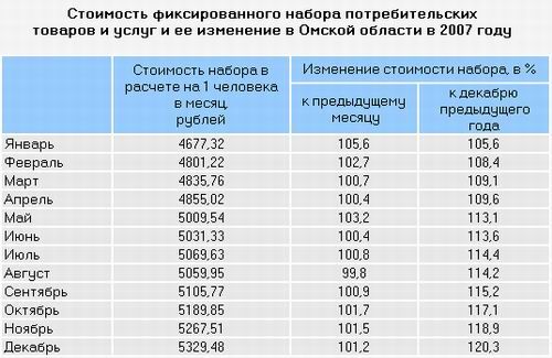 В декабре 2007 года Омская область по стоимости потребительской корзины занимала 2 рейтинговое место среди регионов Сибирского федерального округа, а по Российской Федерации – 24 место (в порядке возрастания показателя).
