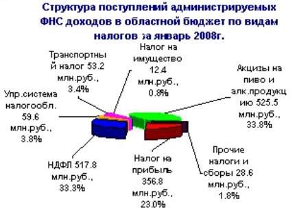 Как сообщает УФНС России по Омской области, основной объем доходов областного бюджета за январь 2008 года обеспечили акцизы на пиво и алкогольную продукцию – 525 миллионов рублей (33,8%). Почти столь же "прибыльным" стал подоходный налог (НДФЛ) – 518 миллионов рублей (33,3%). Замыкает "топ-3 самых доходных" налог на прибыль – 357 миллионов рублей (23%).