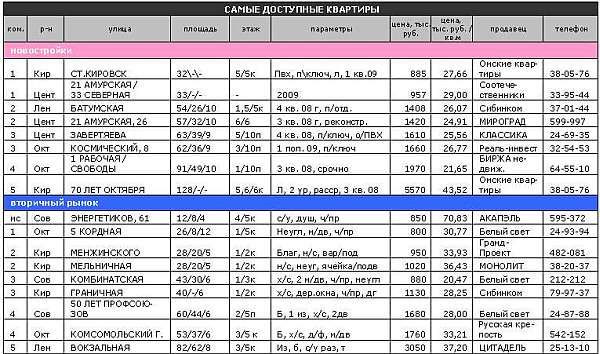 В таблице публикуются цены самых доступных и самых дорогих квартир, предлагаемых на омском рынке недвижимости. Выбор предложений сделан из базы данных журнала "Недвижимость", которая включает более 36 тысяч объявлений. В данной таблице собрана открытая информация по благоустроенным квартирам в черте города. Особый интерес вызывает колонка, которой нет в объявлениях, где рассчитана стоимость одного квадратного метра.
