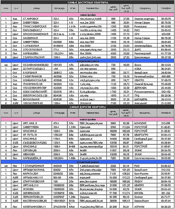 В таблице публикуются цены самых доступных и самых дорогих квартир, предлагаемых на омском рынке недвижимости. Выбор предложений сделан из базы данных журнала "Недвижимость", которая включает более 40 тысяч вариантов объявлений. В данной таблице собрана открытая информация по благоустроенным квартирам в черте города. Особый интерес вызывает колонка, которой нет в объявлениях, где рассчитана стоимость одного квадратного метра.