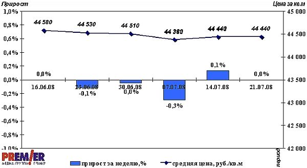 По данным журнала "Недвижимость", средняя стоимость квадратного метра жилья на вторичном рынке составила 44 тысячи 440 рублей, оставшись на уровне недельной давности. С учетом недавних снижений месячное падение цены равно 90 руб./кв.м (-0,2%). При этом "квадрат б/у" остается на 270 рублей - или на 0,6% - дороже, чем в начале года.