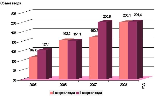 По данным Омскстата, на территории Омска организациями всех форм собственности и индивидуальными застройщиками (гражданами) в 1 полугодии 2008 года введены в действие жилые дома общей площадью 401,5 тысячи квадратных метров (график 1). По сравнению с соответствующим периодом 2007 года ввод жилья в городе увеличился на 11,2%. Таким образом, сохраняется тенденция последних лет - снижение темпов роста ввода жилья. Так в 2006 году было построено на 29% больше, чем в 2005 году, в 2007 году - на 19%, текущий год принес 11% роста (график 2). Впрочем, пугаться падения темпов преждевременно, поскольку на предыдущие годы, отмеченные рекордной прибавкой объемов строительства, пришелся выход отрасли из "ямы". Рост ввода жилья в городе обусловливает широкий выбор вариантов квартир на рынке и является одним из факторов снижения средних цен на новостройки.