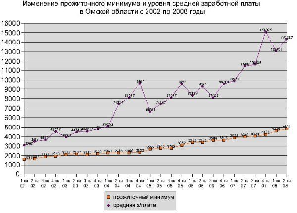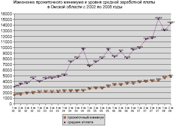 Прожиточный минимум пересматривается ежеквартально на основе обновленной потребительской корзины и сведений о ценах на товары и услуги. За последние годы рост прожиточного минимума для трудоспособного населения плавно шел вверх. Исключение составил 2003 год, когда в третьем квартале прожиточный минимум уменьшился на 4 рубля. В 2006 году в первом полугодии сумма оставалась на одном уровне – 3385 рублей. Минимальная прибавка была в 2005 году, тогда в третьем квартале ПМ увеличился лишь на 6 рублей. Максимально прожиточный минимум для трудоспособного населения увеличился в первом квартале 2008 года – на 382 рубля. Также большие прибавки были в первом и четвертом кварталах 2005 года – по 333 рубля. Сейчас, по сравнению с предыдущим кварталом, величина прожиточного минимума для трудоспособного населения увеличилась на 5% или 231 рубль.