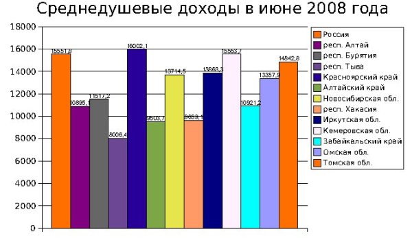 Территориальный орган федеральной службы государственной статистики по Новосибирской области обнародовал данные о среднедушевом доходе населения в Сибирском федеральном округе в июне 2008 года. В среднем по России данный показатель составил 15 тысяч 551,8 рубля. Лидерами по Сибирскому федеральному округу оказались Красноярский край – 16 тысяч 2,1 рубля и Кемеровская область – 15 тысяч 553,7 рубля. Это выше, чем в среднем по стране. Также среди лидеров (на третьем месте) находится Томская область, где июньский среднедушевой доход составил 14 тысяч 842,8 рубля.