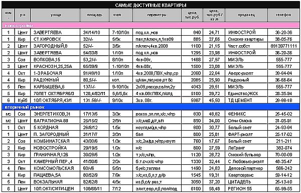 Таблица самых дорогих квартир Омска на 1 сентября 2008 года