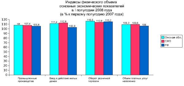 По данным Новосибирскстата, в первом полугодии 2008 года доля Сибирского федерального округа (СФО) в объеме ввода в действие жилых домов в целом по Российской Федерации составила 12,4%, в обороте розничной торговли - 11,6%, по инвестициям в основной капитал и объему платных услуг - 10,3 и 10,2% соответственно. В свою очередь, удельный вес Омской области в СФО по вводу жилья составил 18,7%, оборот розничной торговли - 10,4%, как и платных услуг населению - 10,4%