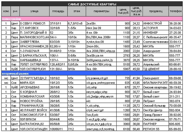 В предлагаемых таблицах приведены цены самых доступных и самых дорогих квартир, представленных на омском рынке недвижимости на 01 октября 2008 года. Выборка предложений сделана из базы данных журнала "Недвижимость", которая включает более 40 тысяч объявлений. К началу IV квартала общий объем предложений на жилищном рынке составил 28 тысяч вариантов квартир общей площадью 1,6 миллиона квадратных метров, стоимость - более 61 миллиарда рублей.