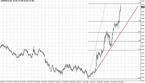 Тем временем российская валюта уверенно преодолела психологическую отметку в 27 рублей за доллар. Многие аналитики говорят, что уровень в 30 рублей за доллар вполне достижим, и не исключают снижения российской валюты до отметки 33-35 рублей. По словам специалистов ИК "Финам", технический анализ показывает, что после прорыва уровня в 27 рублей ближайшая цель - 28,50 рублей за доллар.