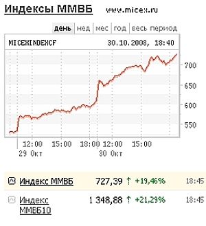 30 октября торги на фондовых биржах закрылись "в плюсе". Эта умеренно позитивная тенденция наблюдается в течение трех дней. Индекс РТС дотянулся до отметки 758.7 пункта (+17,81%), а индекс ММВБ - 727.39 пункта (+19,46%). В оценках ближайших перспектив эксперты расходятся.