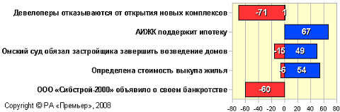 И вновь сразу два события получили одинаковую абсолютную оценку важности, хотя "направления" их воздействия на рынок противоположны. Регионы узнали, по какой цене государство планирует выкупать "недострой" - и это воспринято с оптимизмом. А вот обращение ООО "Сибстрой" в арбитражный суд с заявлением о банкротстве , очевидно, прозвучало тревожным звонком.
