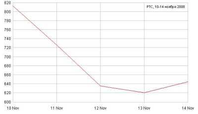 После роста в понедельник уже на следующий день, 11 ноября, индекс ММВБ рухнул более чем на 12,64%, а РТС - на 10,67%. После такого обвала ФСФР закрыла ММВБ до 13 ноября.
