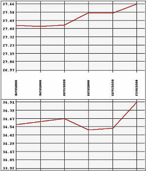 С 24 ноября Банк России принял решение о расширении коридора допустимых колебаний рублевой стоимости бивалютной корзины. Аналогичное решение уже было принято двумя неделями ранее - 11 ноября 2008 года коридор колебаний расширен симметрично на те же 30 копеек "для повышения гибкости курсообразования". С учетом двух расширений коридора колебаний предельная стоимость бивалютной "корзины" составляет 31 рубль.