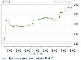 25 ноября российские фондовые индексы демонстрировали разнонаправленное движение. Вслед за ростом последовала фиксация прибыли, а значит, и снижение котировок. По итогам дня индекс РТС остановился на отметке 692,51 пункта (+10,82%), а ММВБ - на 595,15 пункта (-1,6%). Рост, по мнению специалистов, обеспечивается активными покупками ВЭБ.