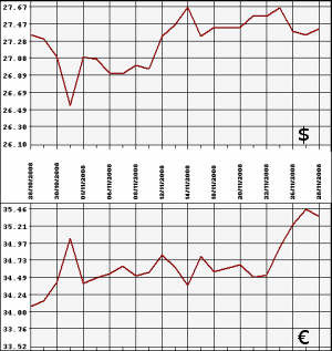 По итогам ЕТС ММВБ 27 ноября, курс доллара с расчетами "завтра" вырос до 27,4080 рубля, евро - снизился до 35,3947 рубля. Банк России на 28 ноября понизил официальный курс евро к рублю до 35,3629 рубля, а курс доллара США - повысил до 27,4216 рубля.По данным АКМ, по итогам единой торговой сессии (ЕТС) межбанковской валютной биржи 27 ноября средневзвешенный курс доллара США с расчетами "завтра" составил 27,4080 рубля. Это почти на 6 копеек больше результатов торгов 26 ноября - 27,3503 рубля. В течение торговой сессии диапазон цен составил 27,3500-27,4475 рубля, объем торгов чуть превысил 3570 миллионов долларов США, число сделок - 1772.