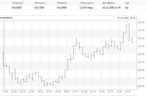 По итогам торгового дня индекс ММВБ вырос на 1,783% и составил 618,64 пункта, индекс РТС достиг отметки 656.13 пункта (+2.21%).