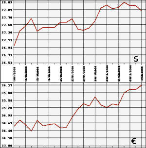 Банк России на 11 декабря понизил официальный курс доллара США к рублю до 27,8671 рубля, курс евро - повысил до 36,1715 рубля. На торгах ММВБ 10 декабря средневзвешенный курс доллара с расчетами завтра составил 27,88 рубля, евро - 36,14 рубля.