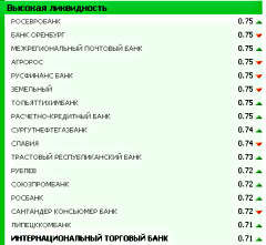 Все банки разделены на шесть групп по уровню ликвидности. В первой группе "очень высокой ликвидности" - 144 банка, высокая ликвидность - у 188 банков, умеренная - у 237 банков, средняя - у 112, низкая - у 61 и очень низкая - у 15. Высочайшая ликвидность (12,44) оказалась у "Форус Банка". Лидирующие позиции в группе "самой высокой ликвидности" (выше 0,75) занимают небольшие и региональные банки - "НОМОС-банк" (0,98), Банк "Сибирь" (0,82). К категории "высокая ликвидность" (от 0,51 до 0,75) отнесены "УРСА банк" (0,57), "Омск-банк"(0,56), "ИТ Банк" (0,71), "Юниаструм банк" (0,69), "Банк Москвы" (0,59). "ОТП банк" (0,49) попал в группу "умеренной ликвидности". А в группе с низкой ликвидностью оказались такие банки, как "Русь-банк", "Банк Жилищного финансирования", "Сиббизнесбанк", "Городской ипотечный банк".