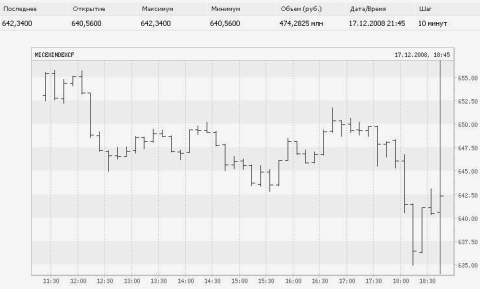 В течение всей сессии 17 декабря российский рынок спокойно ожидал новостей ОПЕК. Принятое решение о снижении с 1 января 2009 года объемов добычи нефти на 2,2 миллиона баррелей в сутки было ожидаемым. К концу торгового дня ситуация на отечественных площадках не сильно отличалась от утренней картины. Индекс РТС завершил торги на отметке 699,86 пункта, увеличившись на 1,73%. ММВБ буквально за последние полчаса торгов успел уйти в небольшой минус, потеряв 0,34%, остановившись на отметке 642,38 пункта. В лидерах роста второй день подряд оставались акции "Полюс Золото" (+15,13%) и "Полиметалла" (+3,64%) - на фоне значительного роста цен на золото и серебро. Кроме того, значительно лучше рынка торговались акции "РусГидро" (+8,763%). Хуже рынка выглядели в среду акции "Аптеки 36 и 6" (-8,48%), ТГК-4 (-6,66%), ТМК (-7,55%).