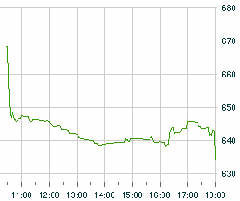 Несмотря на то, что в течение дня ММВБ упал в среднем на 3-4%, к вечеру снижение по наиболее ликвидным акциям замедлилось. Индекс сумел подняться выше 600 пунктов и вышел в небольшой плюс (0,66%) - 612,05 пунктов. РТС закрылся на уровне 634.22 пункта (-5,1%).