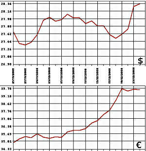 По итогам торгов ЕТС на ММВБ 23 декабря средневзвешенный курс доллара США с расчетами "завтра" составил 28,3601 рубля, что на 5 копеек больше итога предыдущих торгов - 28,3099 рубля. Средневзвешенный курс евро с расчетами "завтра" уменьшился на 4 копейки - с 39,7246 рубля до 39,6762 рубля.