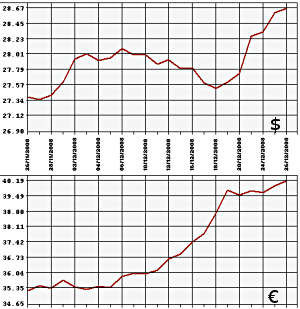 По данным Банка России, официальный курс доллара США на 26 декабря повышен на 6 копеек - с 28,6119 рубля до 28,6735 рубля. Официальный курс евро к рублю повышен на 23 копейки - с 39,9565 рубля до 40,1859 рубля. Стоимость бивалютной корзины (0,45 евро и 0,55 доллара) выросла на 13 копеек - с 33,7169 рубля до 33,8541 рубля.