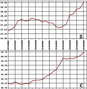 По итогам торгов ЕТС на ММВБ 26 декабря средневзвешенный курс доллара США с расчетами "завтра" составил 28,9922 рубля, что на 31 копейку больше результата предыдущих торгов - 28,6785 рубля. Средневзвешенный курс евро с расчетами "завтра" вырос на 61 копейку - с 40,1898 рубля до 40,8033 рубля.