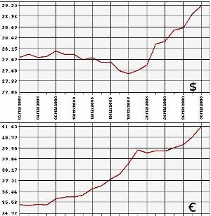 По итогам торгов ЕТС на ММВБ 29 декабря средневзвешенный курс доллара США с расчетами "завтра" составил 29,1813 рубля, что на 81 копейку больше результата предыдущих торгов - 28,9922 рубля. Средневзвешенный курс евро с расчетами "завтра" вырос на 88 копеек - с 40,8033 рубля до 41,6800 рубля.