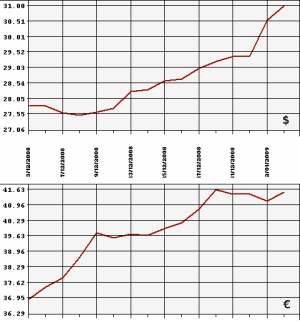 Банк России на 13 января 2009 года повысил официальный курс доллара США к рублю до 30,9981 рубля и курс евро - до 41,5282 рубля. На торгах ММВБ 12 января средневзвешенный курс доллара с расчетами "завтра" составил 31,0517 рубля, курс евро - 41,5871 рубля.