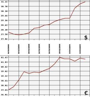 Банк России на 14 января 2009 года повысил официальный курс доллара США к рублю до 31,2226 рубля, а курс евро снизил до 41,4105 рубля. На торгах ММВБ 13 января средневзвешенный курс доллара с расчетами "завтра" составил 31,2118 рубля, курс евро - 41,4300 рубля.