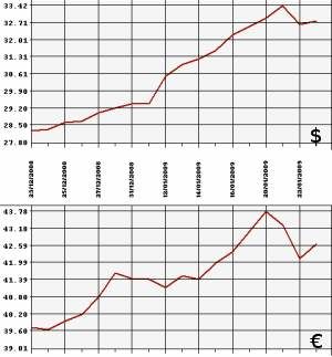 По данным Банка России, официальный курс доллара США на 23 января увеличен более чем на 15 копеек - с 32,6430 рубля до 32,7991 рубля. Официальный курс евро к рублю после вчерашнего стремительного падения показал небольшой рост - на 50 копеек - с 42,1454 рубля до 42,6454 рубля. Стоимость бивалютной корзины (0,45 евро и 0,55 доллара) выросла более чем на 30 копеек - с 36,9191 рубля до 37,2255 рубля.