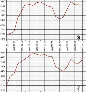 Банк России на 25 февраля 2009 года уменьшил официальный курс доллара США - теперь до 36,0254 рубля, а курс евро, наоборот, повысил - до 45,9108 рубля. На торгах ММВБ 24 февраля средневзвешенный курс доллара с расчетами "завтра" составил 35,9856 рубля, курс евро - 45,9803 рубля.