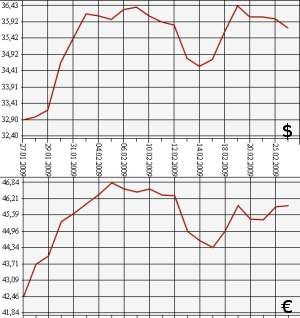 Центробанк продолжает понижать курс доллара США и повышать курс евро. ЦБ РФ на 26 февраля 2009 года установил курс доллара США на уровне 35,7442 рубля, а евро - 45,9670 рубля. На торгах ММВБ 25 февраля средневзвешенный курс доллара с расчетами "завтра" составил 35,7760 рубля, евро - 45,9463 рубля.
