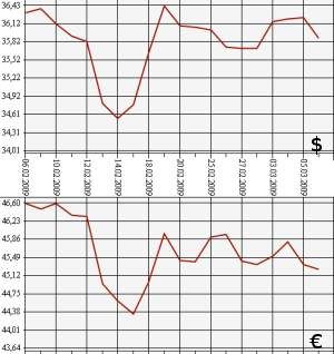 ЦБ РФ продолжает снижать курсы двух основных валют. На 6 марта 2009 года официальный курс доллара США по отношению к рублю уменьшен до 35,8899 рубля, евро - до 45,2572 рубля. На торгах ММВБ 5 марта средневзвешенный курс доллара с расчетами "завтра" составил 35,9049 рубля, курс евро - 45,1359 рубля.
