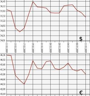 Центробанк снова снижает курс евро. На 11 марта 2009 года официальный курс доллара США уменьшен до 35,4534 рубля, а курс евро - до 45,0365 рубля. На торгах ММВБ 10 марта средневзвешенный курс доллара с расчетами "завтра" составил 35,2174 рубля, курс евро - 44,8168 рубля.