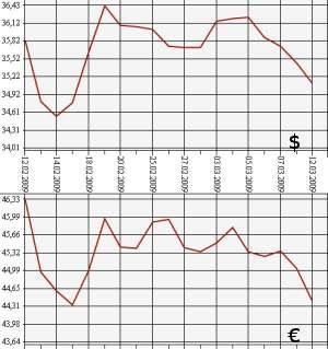 Центробанк на 12 марта 2009 года снизил официальный курс доллара США до 35,1164 рубля, евро - до 44,4258 рубля. На торгах ММВБ 11 марта средневзвешенный курс доллара с расчетами "завтра" составил 35,0881 рубля, курс евро - 44,5783 рубля.