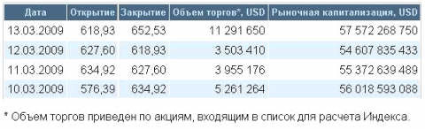 По итогам торгов 13 марта индекс ММВБ вырос на 2,89% до 749,29 пункта. РТС прибавил 5,43% и закрылся на отметке 652,53 пункта.