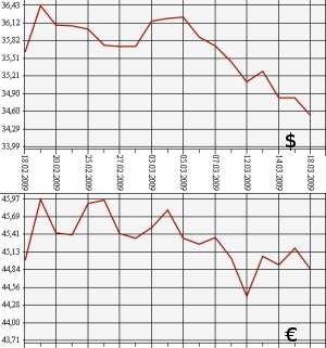 Банк России на 18 марта 2009 года снизил официальный курс доллара США по отношению к рублю до 34,5318 рубля, а курс евро - до 44,8603 рубля. На торгах ММВБ 17 марта средневзвешенный курс доллара с расчетами "завтра" составил 34,5271 рубля, курс евро - 44,8213 рубля.