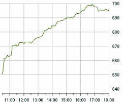 По итогам дня индекс РТС закрылся на уровне 694.69 пункта, подорожав на 6,77%. ММВБ за сессию вырос на 5,63% до 784.94.