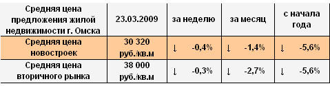 По данным журнала "Омские новостройки" (ИД "Премьер") на 23 марта 2009 года, за третью неделю марта стоимость одного квадратного метра жилья на первичном рынке упала на 130 рублей (-0,4%) и достигла в среднем по городу 30 тысяч 320 рублей. Таким образом, за месяц цена "квадрата" опустилась на 440 рублей (-1,4%), а с начала года - на 1810 рублей (-5,6%). Годовые потери рынка (за 12 месяцев) оцениваются в 19,4% или 7310 рублей "с метра".