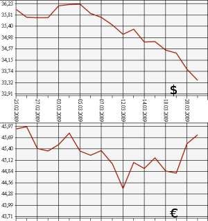 Банк России на 21 марта 2009 года вновь снизил официальный курс доллара США - до 33,4230 рубля, а курс евро повысил до 45,7695 рубля. На торгах ММВБ 20 марта средневзвешенный курс доллара с расчетами "завтра" составил 33,4623 рубля, курс евро - 45,6176 рубля.