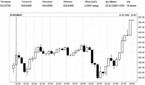 По итогам торгового дня ММВБ вплотную приблизился к уровню 850 пунктов, взлетев на 7,29%, индекс РТС поднялся на 5,78% до отметки в 737.19 пункта.