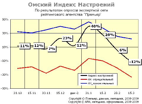 С осени, когда Омск начал ощущать наступление кризиса, Индекс настроений "Премьер-АРИ" (ИН) колебался в диапазоне 7-12%. Однако, в декабре ИН поднялся до 23%, а затем - и выше. В январе ИН впервые с начала замера вышел на максимум - +40%. По мнению аналитиков РА "Премьер", "околоновогодний" взлет оптимизма стал демонстрацией позитивных ожиданий экспертов и доверия официальным заявлениям о том, что российская экономика с легкостью одолеет кризис. Стоит отметить, что ИН в течение пяти месяцев оставалось положительным, хотя в феврале уже достиг своего исторического минимума - +6%.