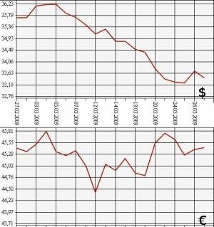 Банк России на 27 марта 2009 года снизил официальный курс доллара США до 33,4668 рубля, а курс евро повысил до 45,4446 рубля. На торгах ММВБ 26 марта средневзвешенный курс доллара с расчетами "завтра" составил 33,4331 рубля, курс евро - 45,4137 рубля.