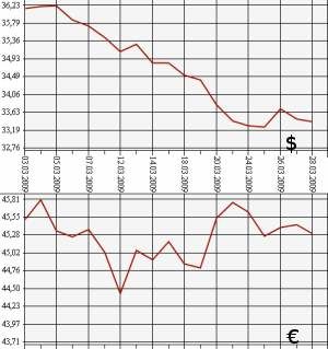 Банк России на 28 марта 2009 года снизил официальный курс доллара США к рублю до 33,4133 рубля, а курс евро - до 45,3151 рубля. На торгах ММВБ 27 марта средневзвешенный курс доллара с расчетами "завтра" составил 33,5362 рубля, курс евро - 45,0051 рубля.